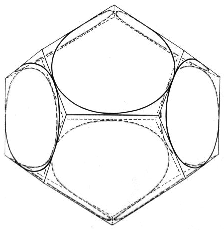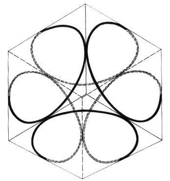 Betrachtet man diese Bahn vom Mittelpunkt der Kugel aus, also aus der Sicht des Kernes, so stellt man fest, dass zwar vier gekrümmte tropfenförmige Flächenstücke zu sehen sind, wobei jedes umlaufene Flächenstück ein Magnetfeld am Kern erzeugen könnte.